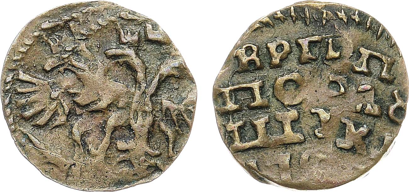 Медь. 0,75г. Кадашевский монетный двор. Уздеников 2433. Биткин подобен 3707. Дьяков 199, 4072(R0). AU 58.