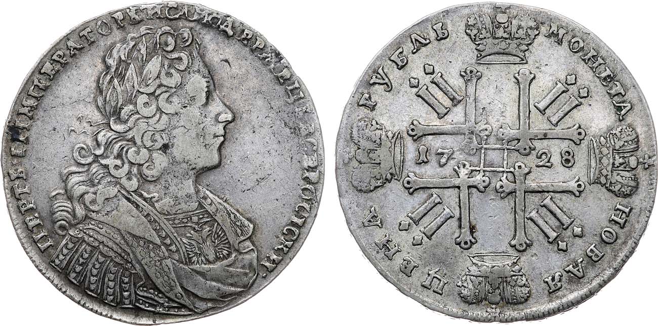 Серебро. 27,79г. Кадашевский монетный двор. Портрет образца 1728 года. Аверс: ошибка в имени императора "ПЕРТЬ". Реверс: обычная "Ц" в слове "ЦЕНА". Уздеников 0686(•). Биткин 52(R1). Петрунин G-№52(-). 6 рублей по Ильину. Дьяков 105, 9. XF.