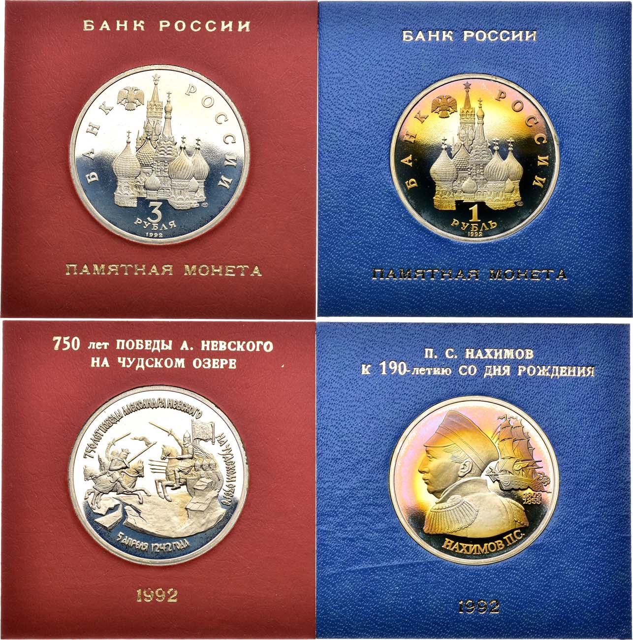 Медно-никелевый сплав. 3 рубля 1992 года. ЛМД. 750 лет Победе Александра Невского на Чудском озере. Тираж 600000 экз. KM 298. BU. 1 рубль 1992 года. ЛМД. 190 лет со дня рождения Павла Степановича Нахимова. Тираж 400000 экз. KM 306. PROOF. BU/PROOF.