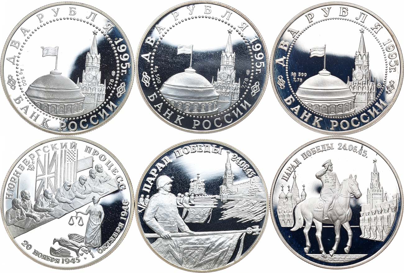 2 рубля 1995 года. Ленинградский монетный двор. Парад Победы в Москве (Флаги у Кремлёвской стены). Серебро. 15,78 г. ЦБ РФ 5110-0007. PROOF. 2 рубля 1995 года. Московский монетный двор. Парад Победы в Москве (маршал Жуков на Красной площади в Москве). Серебро. 15,95 г. ЦБ РФ 5110-0008. PROOF. 2 рубля 1995 года. Ленинградский монетный двор. Нюрнбергский процесс. Серебро. 15,80 г. ЦБ РФ 5110-0009. PROOF. PROOF.