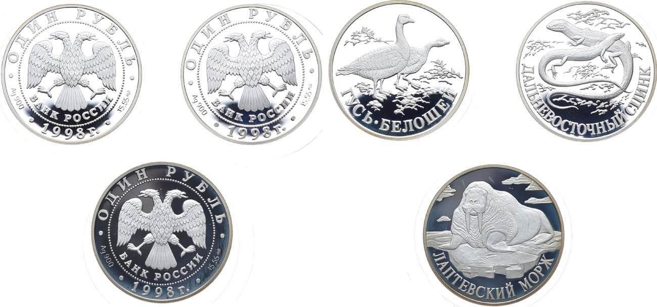 Серебро. 1 рубль 1998 года. СПМД. Серебро. 17,44 г. Гусь белошей. Проба 900. Тираж 15000 экз. ЦБ РФ 5109-0038. PROOF. 1 рубль 1998 года. СПМД. Серебро. 17,44 г. Дальневосточный сцинк. Проба 900. Тираж 15000 экз. ЦБ РФ 5109-0036. PROOF. 1 рубль 1998 года. СПМД. Серебро. 17,44 г. Лаптевский морж. Проба 900. Тираж 15000 экз. ЦБ РФ 5109-0037. PROOF. PROOF.
