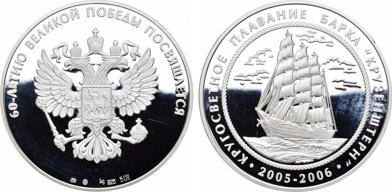 Серебро. 169,04г. Диаметр 60 мм. Московский монетный двор. Аверс: внизу вдоль канта 4 клейма: ММД, Женская голова в кокошнике вправо, Ag 925, 5 OZ. PROOF 66.