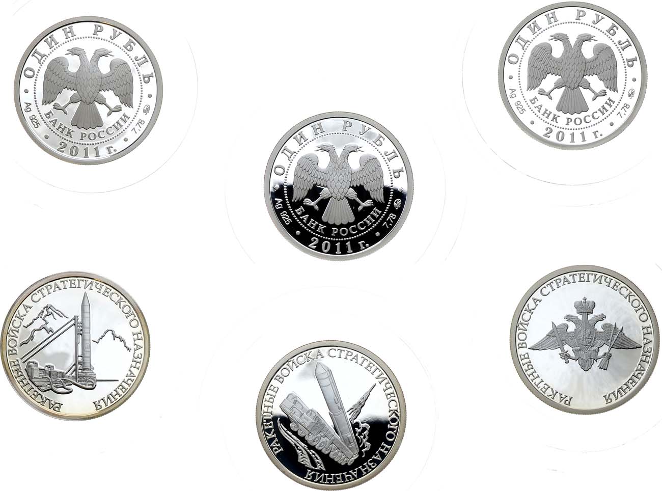 Серебро. 1 рубль 2011 года. Вооруженные Силы РФ - Ракетные войска стратегического назначения. Эмблема. Серебро. 8,52 г. Московский монетный двор. Проба 925. Тираж 5000 экз. KM Y 1310. PROOF. 1 рубль 2011 года. Вооруженные Силы РФ - Ракетные войска стратегического назначения. Шахтный ракетный комплекс. Серебро. 8,49 г. Московский монетный двор. Проба 925. Тираж 5000 экз. KM Y 1312. PROOF. 1 рубль 2011 года. Вооруженные Силы РФ - Ракетные войска стратегического назначения. Мобильный ракетный комплекс. Серебро. 8,48 г. Московский монетный двор. Проба 925. Тираж 5000 экз. KM Y 1311. PROOF. PROOF.