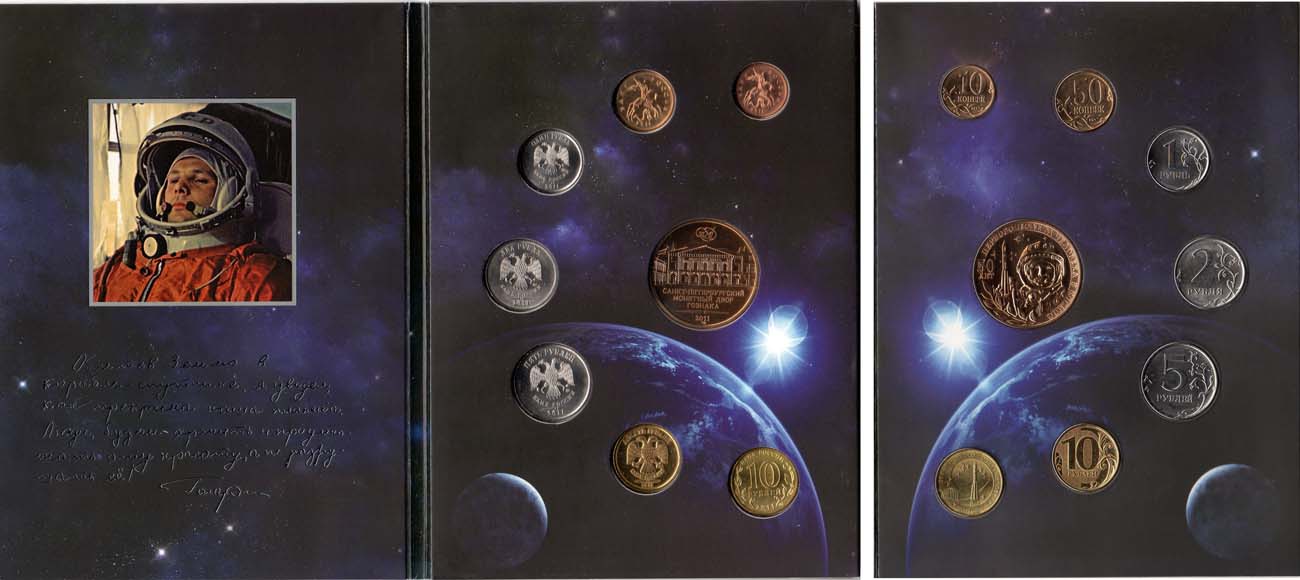 Санкт-Петербургский монетный двор. Оригинальный картонный буклет. Серия 50 лет первого полёта человека в космос (Ю.А. Гагарин) 10 рублей 2011 года. СПМД. 50 лет первого полёта человека в космос 10 рублей 2011 года. СПМД. 5 рублей 2011 года. СПМД. 2 рубля 2011 года. СПМД. 1 рубль 2011 года. СПМД. 50 копеек 2011 года. СПМД. 10 копеек 2011 года. СПМД. Жетон 2011 года. СПМД. 50 лет первого полёта человека в космос (Ю.А. Гагарин). UNC.