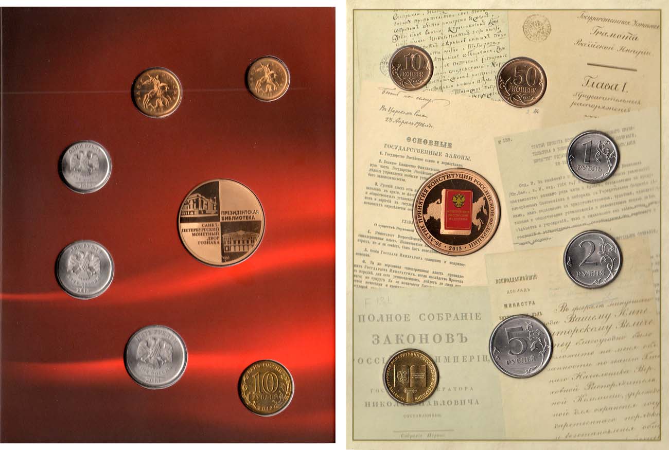 Санкт-Петербургский монетный двор. Оригинальный картонный буклет. Серия 20 лет принятия Конституции Российской Федерации. 10 рублей 2013 года. СПМД. 20 лет принятия Конституции Российской Федерации. 5 рублей 2013 года. СПМД. 2 рубля 2013 года. СПМД. 1 рубль 2013 года. СПМД. 50 копеек 2013 года. СПМД. 10 копеек 2013 года. СПМД. Жетон 2013 года. СПМД. 20 лет принятия Конституции Российской Федерации. Цветная эмаль. UNC.