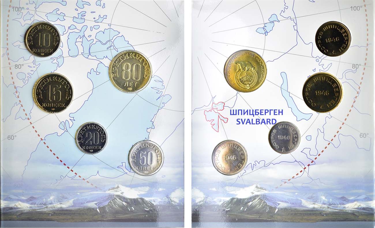 Санкт-Петербургский монетный двор. Состав набора: 1) Платежный жетон-бона «Арктикуголь» остров Шпицберген 10 Копеек 1946 г. Новодел. 2012 г. Реверс: клеймо «Знак Санкт-Петербургского монетного двора». Латунь. Фролов№5.1.2. Тираж 1500 шт. 2) Платежный жетон-бона «Арктикуголь» остров Шпицберген 15 Копеек 1946 г. Новодел. 2012 г. Реверс: клеймо «Знак Санкт-Петербургского монетного двора». Латунь. Фролов№5.2.2. Тираж 1500 шт. 3) Платежный жетон-бона «Арктикуголь» остров Шпицберген 20 Копеек 1946 г. Новодел. 2012 г. Реверс: клеймо «Знак Санкт-Петербургского монетного двора». Мельхиор. Фролов№5.3.2. Тираж 1500 шт. 4) Платежный жетон-бона «Арктикуголь» остров Шпицберген 50 Копеек 1946 г. 2012 г. Реверс: клеймо «Знак Санкт-Петербургского монетного двора». Мельхиор. Фролов№5.4.2. Тираж 1500 шт. 5) Жетон «В память 80-летия ФГУП Государственного треста «Арктикуголь» остров Шпицберген». 2012 г. Клеймо на реверсе: «Знак Санкт-Петербургского монетного двора». Латунь. Фролов№5.5.2. Тираж 1500 шт. PROOF.
