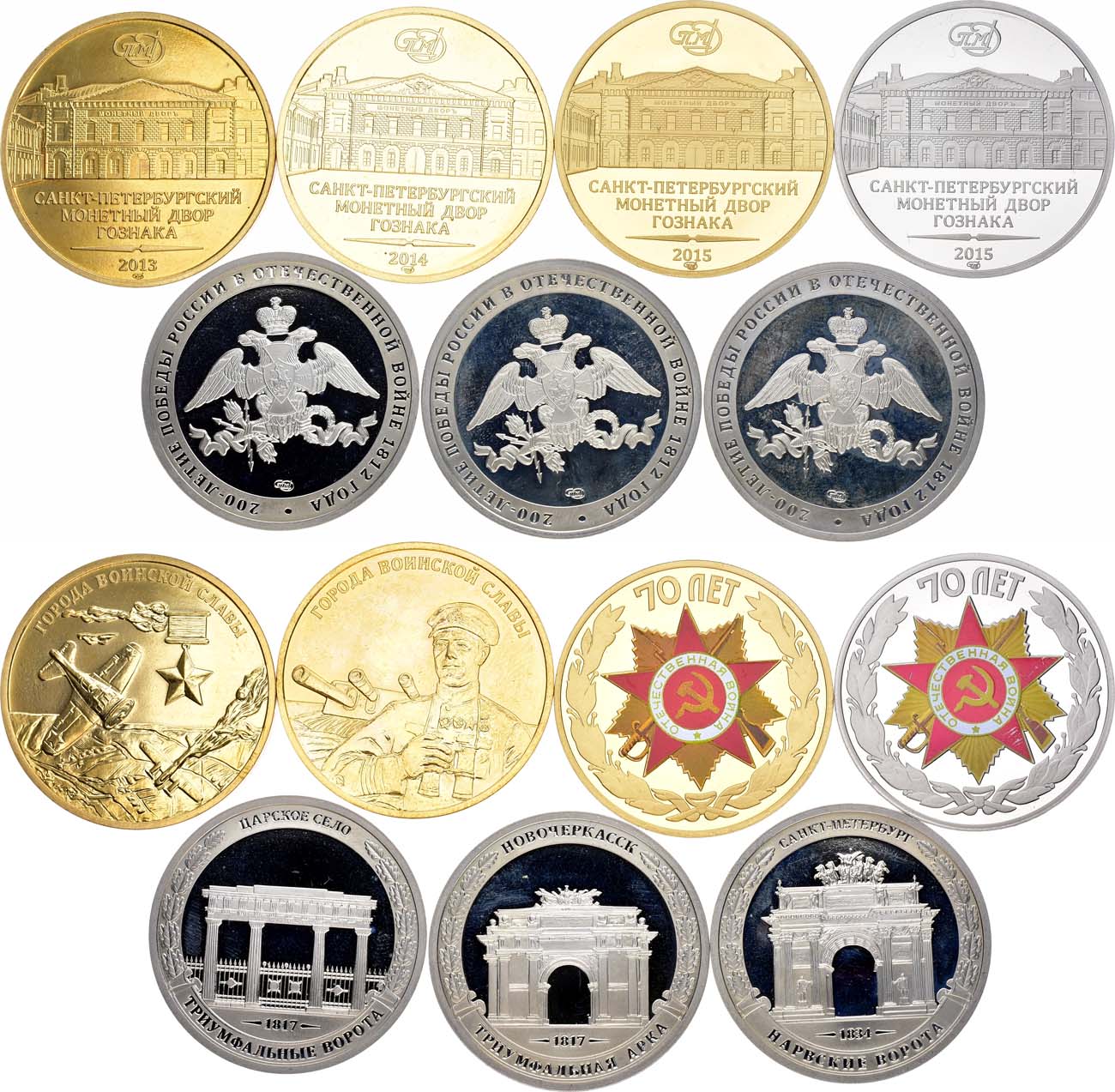 Жетон 2012 года. В память 200-летия победы в Отечественной войне 1812 года. Триумфальные ворота. Медно-никелевый сплав, 16,63 г. Диаметр 35 мм. СПМД. Жетон 2012 года. В память 200-летия победы в Отечественной войне 1812 года. Триумфальная арка. Медно-никелевый сплав, 16,56 г. Диаметр 35 мм. СПМД. Жетон 2012 года. В память 200-летия победы в Отечественной войне 1812 года. Нарвские ворота. Медно-никелевый сплав, 16,69 г. Диаметр 35 мм. СПМД. Жетон 2013 года. Серия "Города воинской славы". Латунь, 16,76 г. Диаметр 35 мм. СПМД. Жетон 2014 года. Серия "Города воинской славы". Латунь, 16,30 г. Диаметр 35 мм. СПМД. Жетон 2015 года. 70 лет Победы в Великой Отечественной войне. Латунь, термопечать. 16,26 г. Диаметр 35 мм. СПМД. Жетон 2015 года. 70 лет Победы в Великой Отечественной войне. Медно-никелевый сплав, термопечать. 16,81 г. Диаметр 35 мм. СПМД. PROOF.