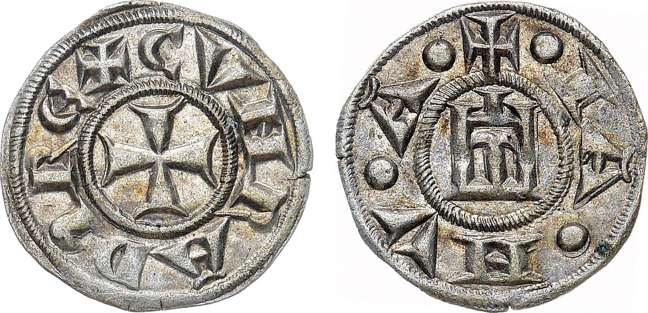 Серебро. 0,84г. Аверс: изображение креста внутри окружности; легенда "CVNRADI REX". Реверс: изображение замка внутри окружности; легенда "+ IA NV A". AU.