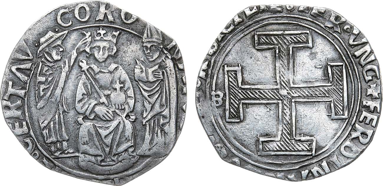Серебро. 3,48г. Минцмейстер Savlatore Miroballo (M под крестом). Аверс: "CORONATVS • QVIA • LEGITIME • CERTAVIT" (Коронован в законном стремлении). Папский легат - кардинал и архиепископ Бари (Bari) Латино Орсино (Latino Orsino) водружает корону на голову короля (Фердинанда) сидящего на троне. Реверс: "FERDINANDVS D G R SICI IER VN". Иерусалимский крест в центре. XF.