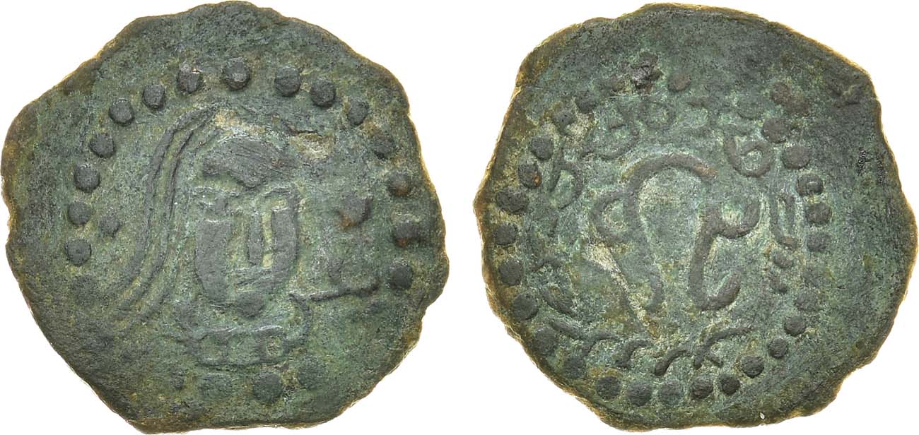 Бронза. 1,71г. Канка. Аверс: голова правителя со звёздами по сторонам. Реверс: тамга с согдийской легендой вокруг. VF.