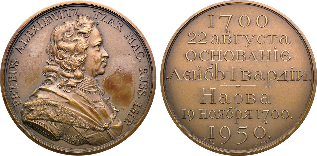 Томпак. 99,25г. Диаметр 59 мм. Франция, Парижский монетный двор. Медаль выполнена по эскизу художника Н.В.Зарецкого (без подписи) с использованием штемпеля аверса работы Ж. Дювивье, 1717 г. (аверс — на обрезе изображения: "DU VIVIER F."). На гурте — клейма Парижского монетного двора с 1.1.1880 г. (рог изобилия) и металла: «BRONZE». AU.