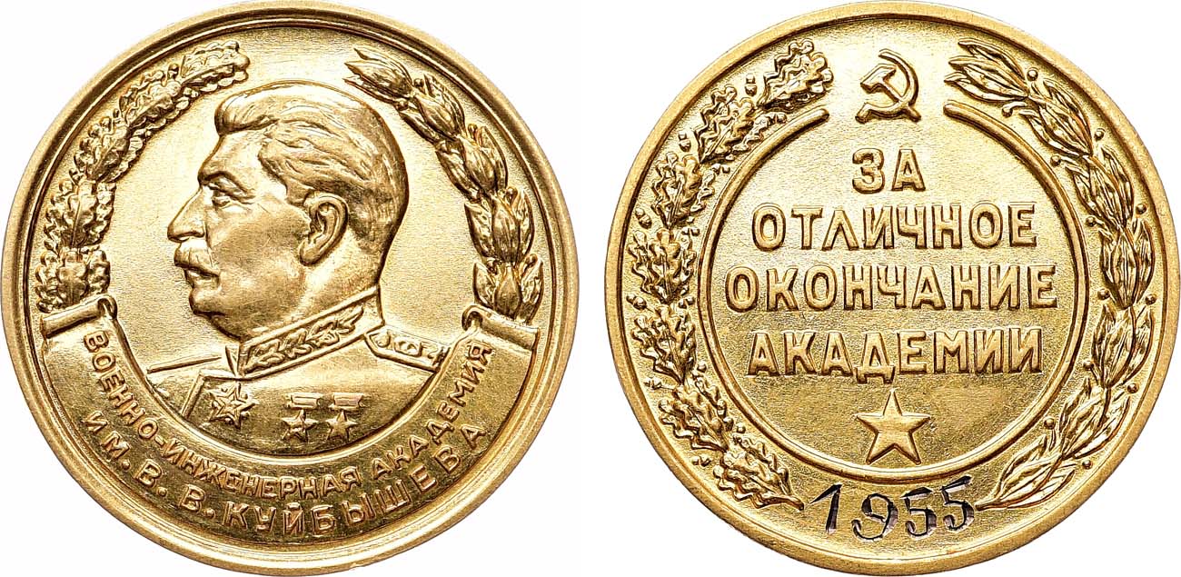 Золото. 11,11г. Диаметр 26 мм. Московский монетный двор, 1951-1958 гг. Без подписи медальера. Реверс: внизу выгравирована дата окончания академии «1955». UNC.
