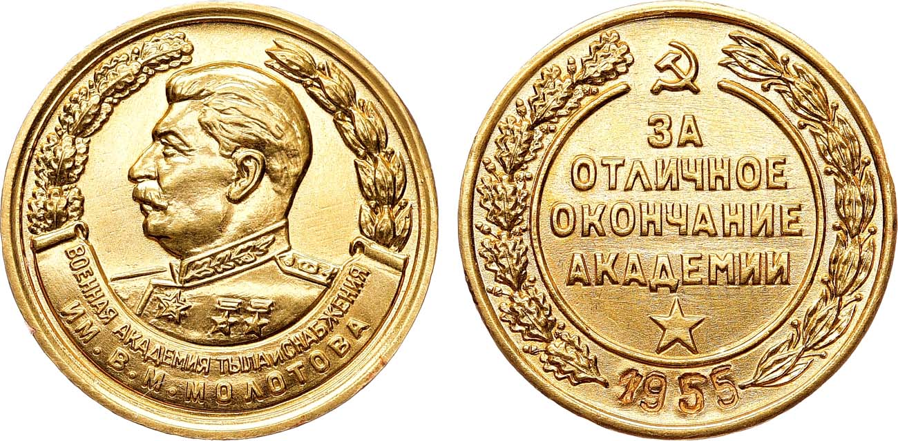 Золото. 10,83г. Диаметр 26 мм. Московский монетный двор, 1951-1958 гг. Без подписи медальера. Реверс: внизу выгравирована дата окончания академии «1955». UNC.