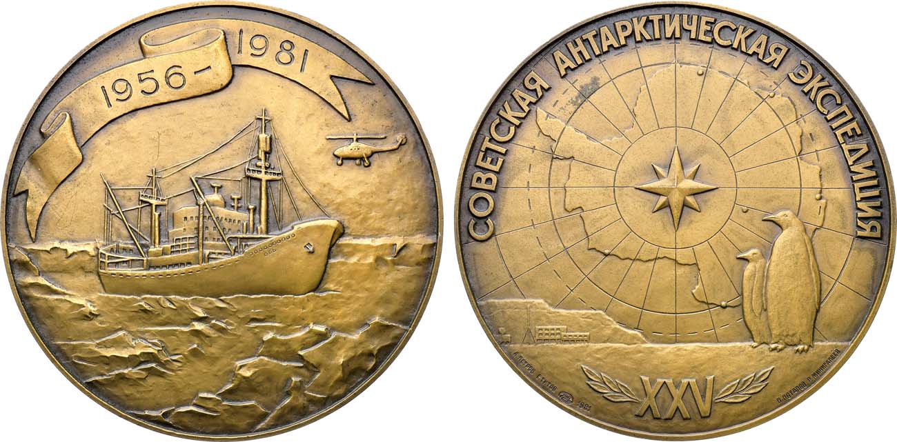 На медали ошибочно указан первый инициал автора - А. Петров. Экспедиция была организована в преддверии Международного геофизического года. В неё входили как сезонные, так и зимующие в Антарктике научно-исследовательские отряды. Руководителем первой экспедиции был назначен океанолог и опытный полярный исследователь Михаил Михайлович Сомов. Целью экспедиции было создание исследовательской станции на антарктическом побережье, а также сезонной полевой базы в центральной области материка.