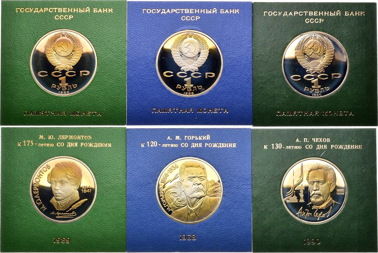 Медно-никелевый сплав. 1 рубль 1988 года. ЛМД. 120 лет со дня рождения Максима Горького. KM 209. PROOF. 1 рубль 1989 года. ММД. 175 лет со дня рождения Михаила Юрьевича Лермонтова. KM 228. PROOF. 1 рубль 1990 года. ЛМД. 130 лет со дня рождения Антона Павловича Чехова. KM 240. PROOF. PROOF.