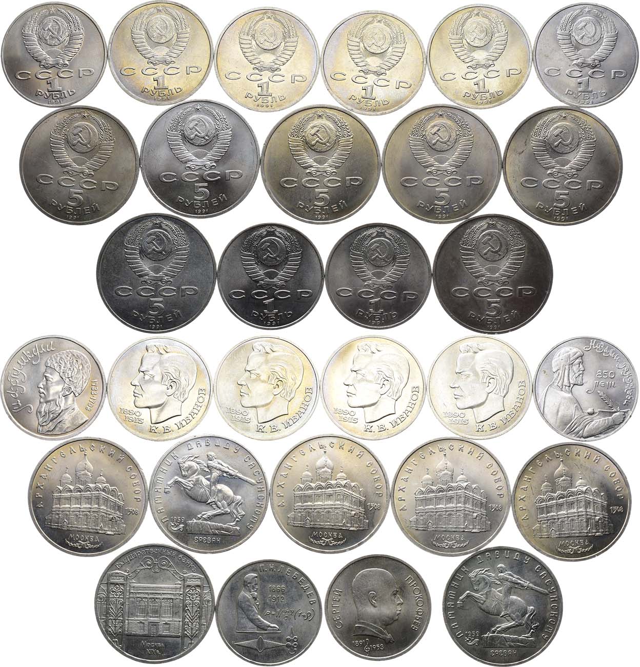 Медно-никелевый сплав. 5 рублей 1991 года. ЛМД. Памятник Давиду Сасунскому, г. Ереван. Тираж 2500000 экз. КМ 273. UNC. 2 штуки. 5 рублей 1991 года. ЛМД. Архангельский Собор, г. Москва. Тираж 2500000 экз. КМ 271. UNC. 4 штуки. 5 рублей 1991 года. ЛМД. Государственный банк СССР, г. Москва. Тираж 2500000 экз. КМ 272. AU. 1 рубль 1991 года. ЛМД. 100 лет со дня рождения Константина Васильевича Иванова. Тираж 2500000 экз. КМ 282. UNC. 4 штуки. 1 рубль 1991 года. ЛМД. 100 лет со дня рождения Сергея Сергеевича Прокофьева. Тираж 2500000 экз. КМ 263. UNC. 1 рубль 1991 года. ММД. 125 лет со дня рождения Петра Николаевича Лебедева. Тираж 2500000 экз. КМ 261. AU. 1 рубль 1991 года. ММД. 850 лет со дня рождения Низами Гянджеви. Тираж 2500000 экз. КМ 284. UNC. 1 рубль 1991 года. ММД. Туркменский поэт и мыслитель Махтумкули. Тираж 2500000 экз. КМ 383. UNC. AU/UNC.