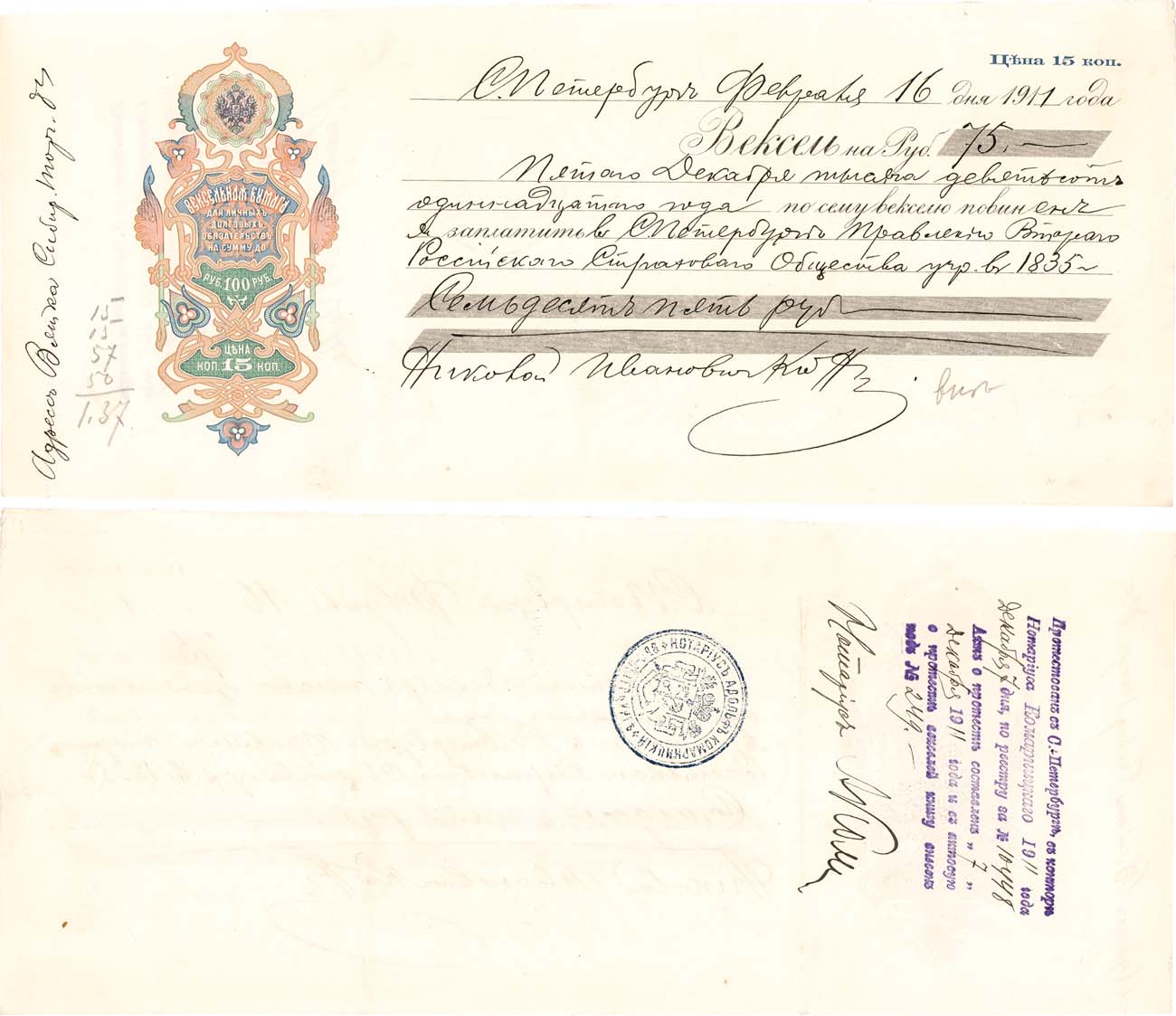 Водяной знак с гербом Российской империи и годом. Санкт-Петербург 16 февраля 1911 года. Вексель на 75 рублей. 5 декабря 1911 года повинен заплатить Санкт-Петербургскому Правлению Второго Российского Страхового Общества, учрежденному в 1835 году, 75 рублей. Подпись: Николай Иванович Фамилия неразборчиво. С протестом. Опротестован в конторе нотариуса Комарницкого 7 декабря 1911 года (синяя печать на оборотной стороне). XF/aUNC.