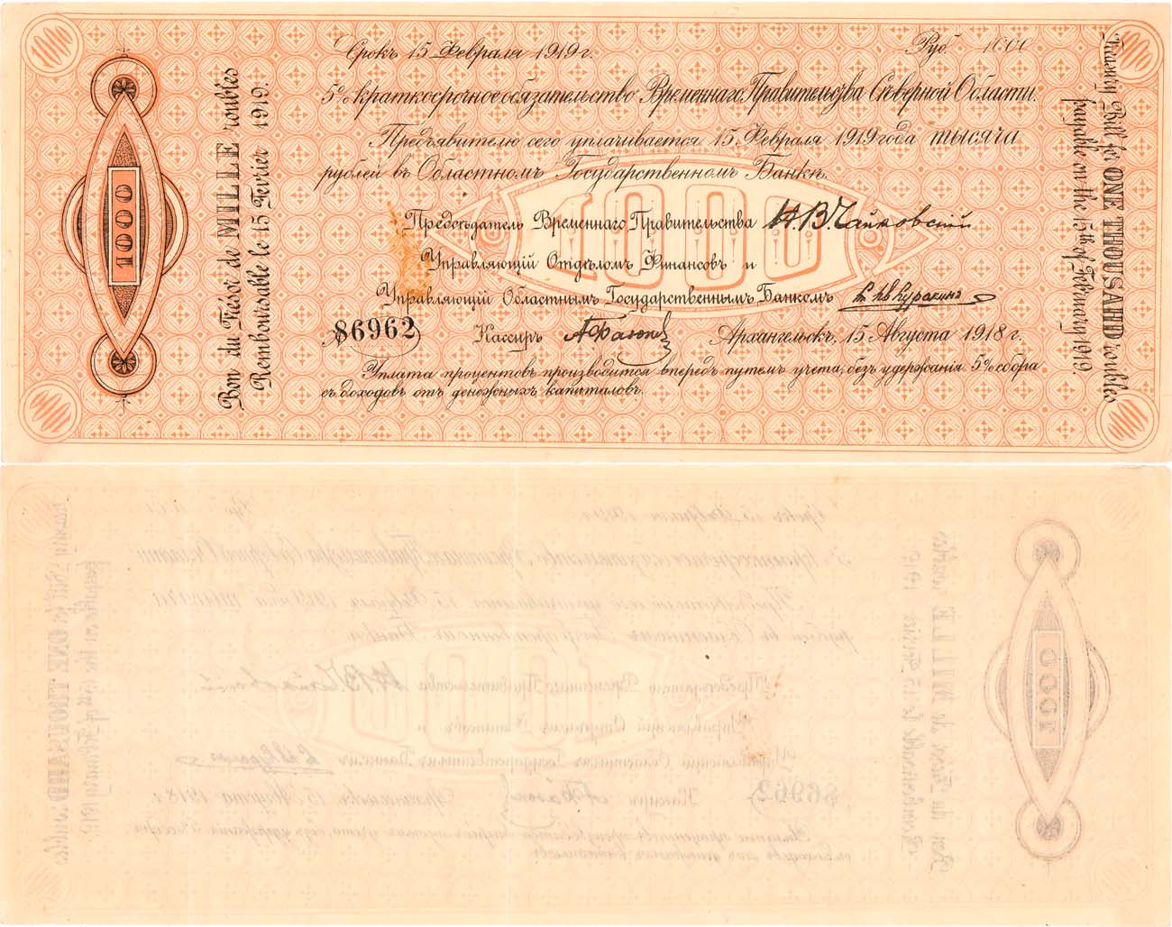 Подписи Куракина и Фадеева впечатаны позднее. №86962 - чёрные чернила. Председатель Правительства - Н.В. Чайковский. Кардаков II.3.3 (12 дойчмарок). Находились в обращении очень короткое время, т.к. они позднее изымались в связи с преобразованием Верховного Управления Северной области во Временное Правительство. XF+.