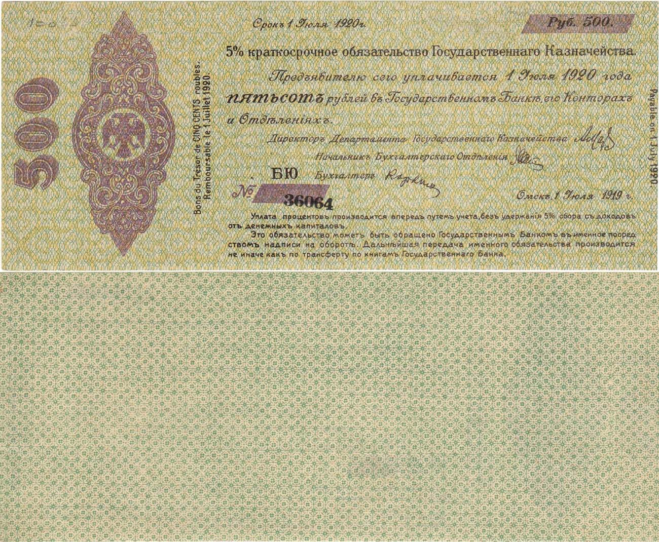 Изначально 5% краткосрочные обязательства были подготовлены к выпуску Временным Сибирским Правительством. (Председатель - П.Я. Дербер, П.В. Вологодский). Но уже с 1 декабря 1918 года с использованием клише обязательств Сибирского Временного Правительства в 500, 1000 и 5000 рублей стали выпускаться такие же 5; обязательства Государственного казначейства Временного Российского Правительства (верховный Правитель - адмирал А.В. Колчак).