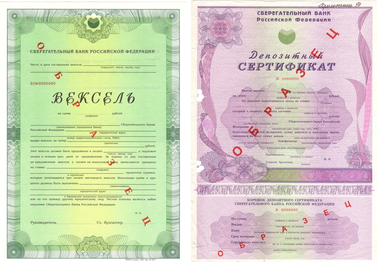 Образец Векселя Бумага с водяными знаками. МПФ Гознака 1994 года. Образец Депозитного сертификата №0000000. МТ Гознака 1995 года. Бумага с водяными знаками. AU/UNC.