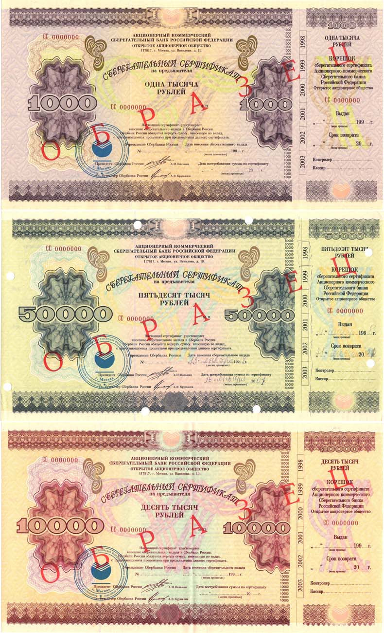 50000 рублей 1997 года. Сберегательный сертификат. СС 0000000. С корешком. ОБРАЗЕЦ. Печать г. Москва. 10000 рублей 1997 года. Сберегательный сертификат. СС 0000000. С корешком. ОБРАЗЕЦ. Печать г. Москва. 1000 рублей 1997 года. Сберегательный сертификат. СС 0000000. С корешком. ОБРАЗЕЦ. Печать г. Москва. AU/UNC-.