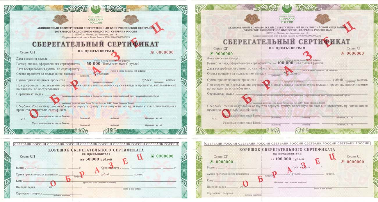 100000 рублей 2006 года. Сберегательный сертификат на предъявителя. СГ 0000000. С корешком. ОБРАЗЕЦ. 50000 рублей 2003 года. Сберегательный сертификат на предъявителя. СП 0000000. С корешком. ОБРАЗЕЦ. UNC-.