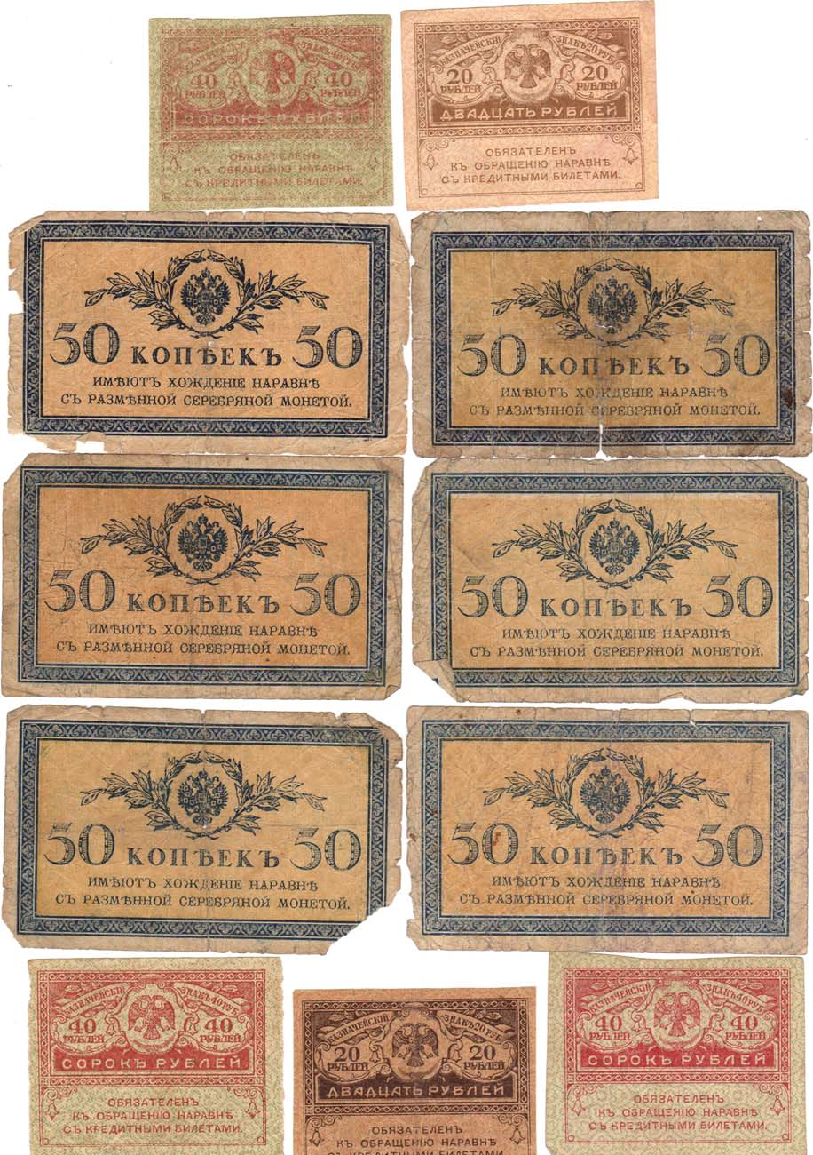 50 копеек 1915 года (6 экз.). 40 рублей 1917 года (3 экз.) "Керенки". 20 рублей 1917 года (2 экз.) "Керенки". G/XF.