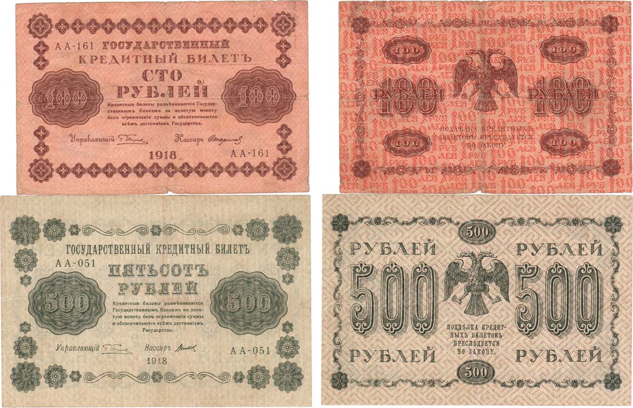 500 рублей 1918 года. Серия АА-051. Подписи: Пятаков/Титов. 100 рублей 1918 года. Серия АА-161. Подписи: Пятаков/Стариков. VF.