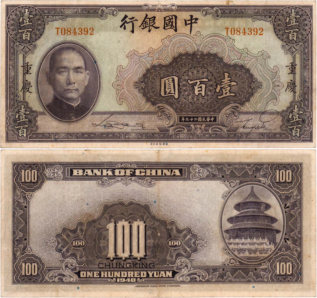 Серия Т 084392 (красная). Типография AMERICAN BANK NOTE COMPANY. Оборотная сторона-Храм Неба. KM 88b. XF.