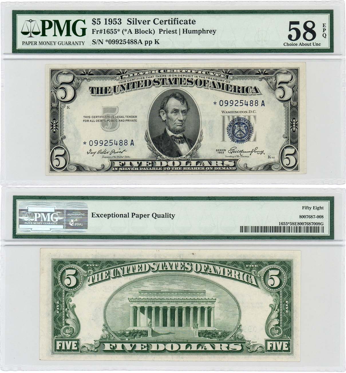 США. 5 долларов серии 1953 года. Замещение. Серия +09925488А. В слабе PMG 58 EPQ Choice About Unc.