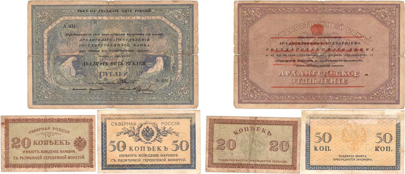 Архангельское отделение государственного банка. Чек на 25 рублей 1918 года. "Моржовка", с регистрацией. Северная Россия. Билет. 50 копеек (образца 1918) года. 1-й выпуск (орел с коронами). Изготовитель / типография - Waterlow & Sons (W&S). Кардаков II.3.20. Северная Россия. Билет. 20 копеек (образца 1918) года. 1-й выпуск (орел с коронами). Изготовитель / типография - Waterlow & Sons (W&S). Кардаков II.3.19. F/VF.