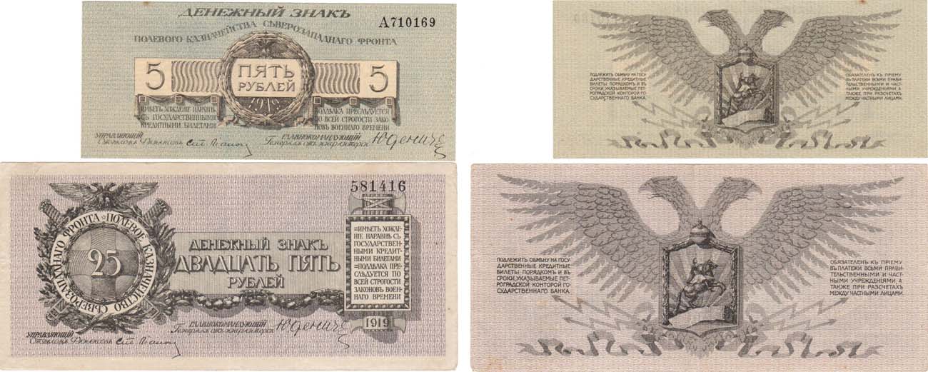 Сборный лот из 2-х денежных знаков Полевого Казначейства Северо-Западного фронта 1919 года.