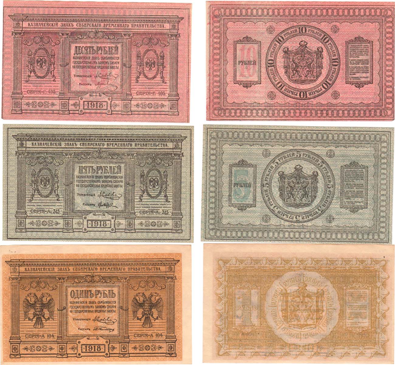 10 рублей 1918 года. Серия Г-405. Бумага тонкая. Кардаков XI.2.3а. PickS818. AU. 5 рублей 1918 года. Серия А-315. Бумага тонкая. Кардаков XI.2.2. PickS817. XF/AU. 1 рубль 1918 года. Серия А-104. Бумага тонкая. Кардаков XI.2.1. PickS816. UNC-. XF/UNC-.