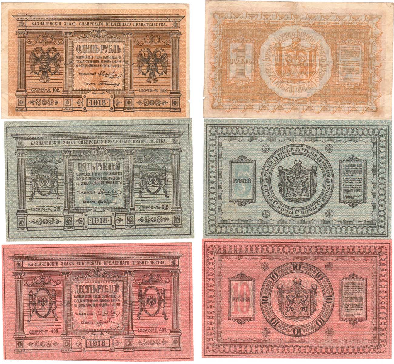 10 рублей 1918 года. Серия Г-409. Бумага тонкая. Кардаков XI.2.3а. PickS818. XF/AU. 5 рублей 1918 года. Серия А-318. Бумага тонкая. Кардаков XI.2.2. PickS817. XF. 1 рубль 1918 года. Серия А-102. Бумага тонкая. Кардаков XI.2.1. PickS816. XF. XF/AU.