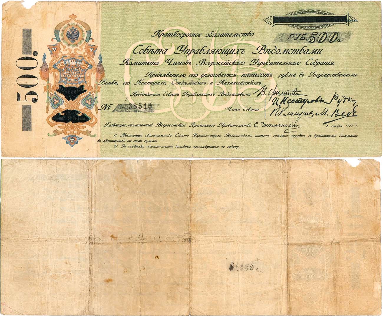 г. Уфа, 1918г. №38513. Отпечатана на вексельной бумаге образца 1913 года. Односторонняя печать. Кардаков Х.2.47 (5 дойчмарок). Большеформатная бона 315х130 мм. VF.