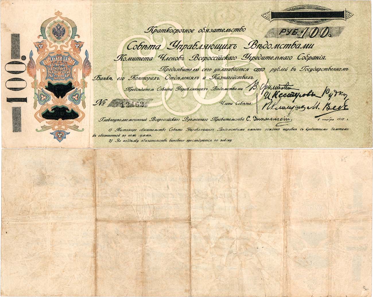 Совет Управляющего Ведомствами Комитета Членов Всероссийского Учредительного Собрания, г. Уфа, 1918г. №12462. Отпечатана на вексельной бумаге образца 1913 года. Односторонняя. Кардаков Х.2.45 (3 дойчмарки). VF-/VF. Большеформатная бона 315х130 мм. VF-/VF.