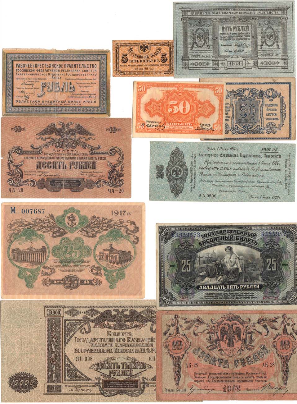 ВСЮР. Билет государственного казначейства. 10000 рублей 1919 года. Серия ЯН-008. ВСЮР. Билет государственного казначейства. 10 рублей 1919 года. Серия ЧА-20. Одесса. 25 рублей 1917 года. Разменный билет. Серия М 007687. Ростов-на-Дону. Денежный знак. 10 рублей 1918 года. Серия АК-28. Временное правительство Дальнего Востока. Государственный кредитный билет. 25 рублей 1918 (1920) года. Серия БЛ 559873. Две подписи. Временное правительство Дальнего Востока. Государственный кредитный билет. 50 копеек (1920) года. Две подписи. Сибирское Временное правительство. Казначейский знак. 5 рублей 1918 года. Серия А.319. Омск. Колчак. Краткосрочное обязательство. 25 рублей 1919 года. Срок 1 июля 1920 года. Серия АА 0200. Екатеринбург. Кредитный билет. 1 рубль 1918 года. Серия Р-016. Екатеринодар. Разменный денежный знак. 50 копеек (1918) года. Дальний Восток. Разменный денежный знак. 5 копеек 1918 года. VF/AU.