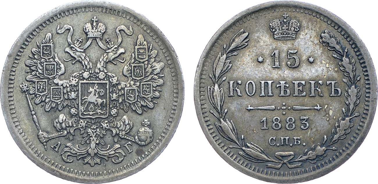 15 копеек 1883 года с инициалами минцмейстера "АГ" встречаются довольно редко.