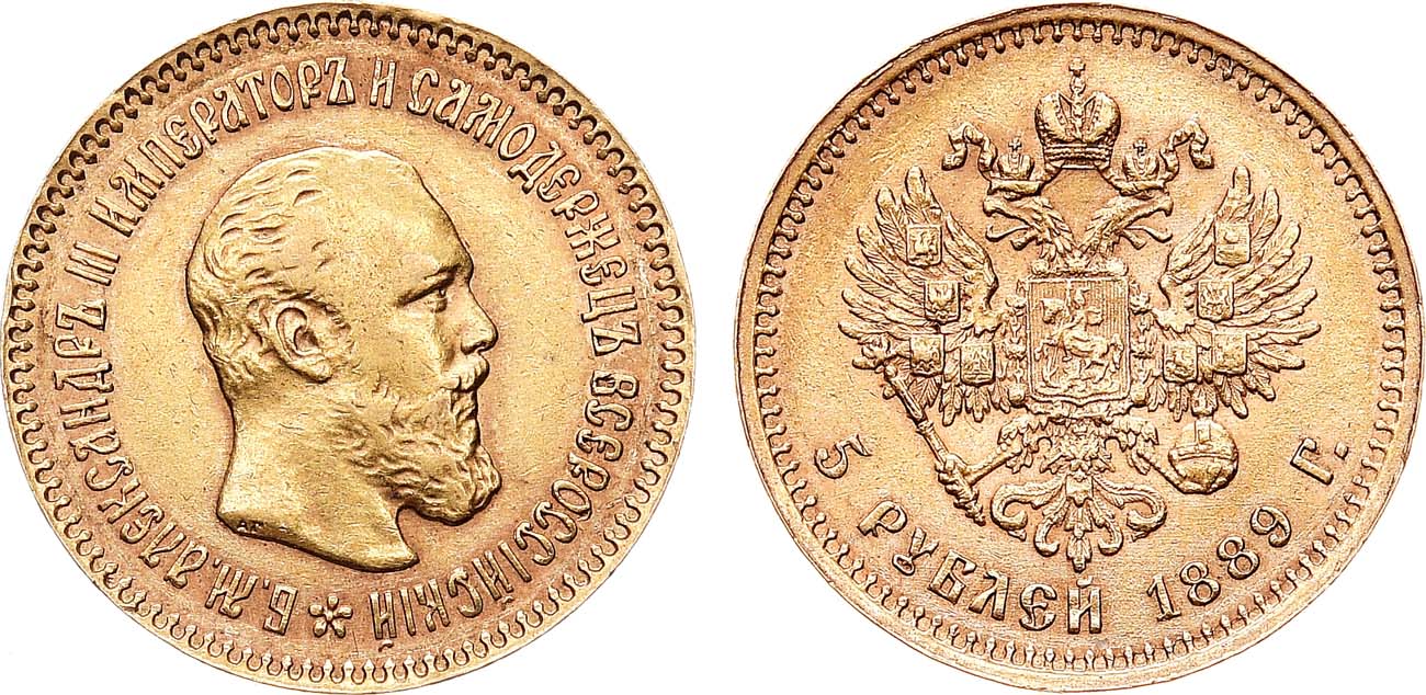5 рублей 1889 года с инициалами медальера «А.Г.» в обрезе шеи встречаются редко.