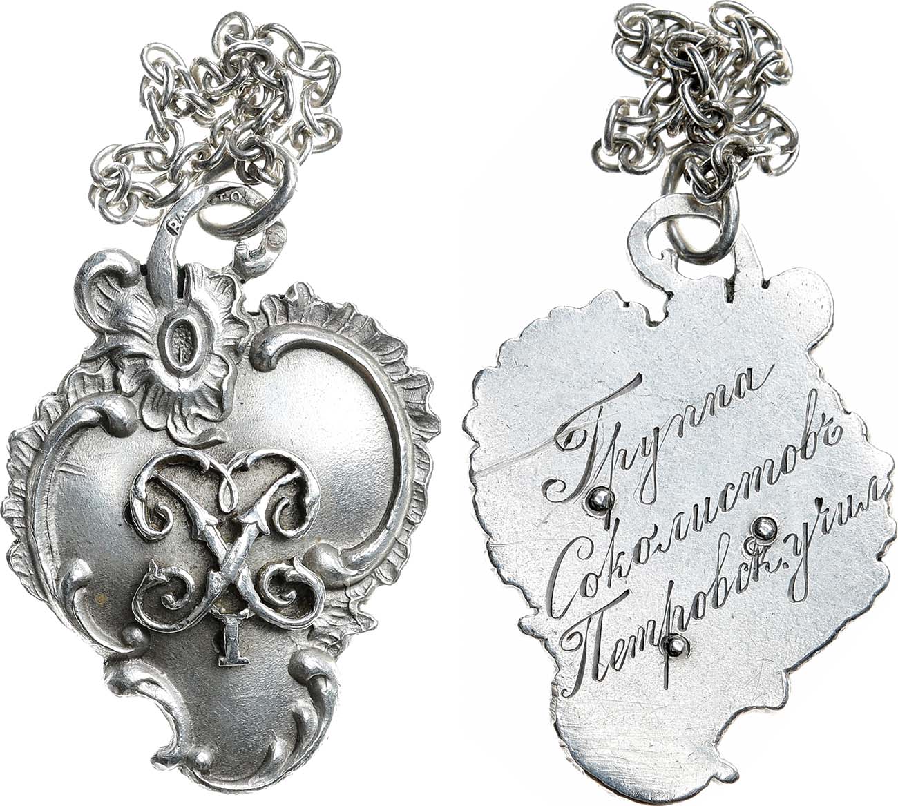 Серебро. 11,05г. Размеры 34х26,4 мм. Российская Империя, частная мастерская. Клейма на ушке: фирменное "ВА", обозначение металла "84", пробирное "женская голова вправо". Реверс: гравировка "Группа / Соколоистовъ / Петровск. учил". С оригинальным соединительным кольцом и цепочкой для ношения. AU/UNC.