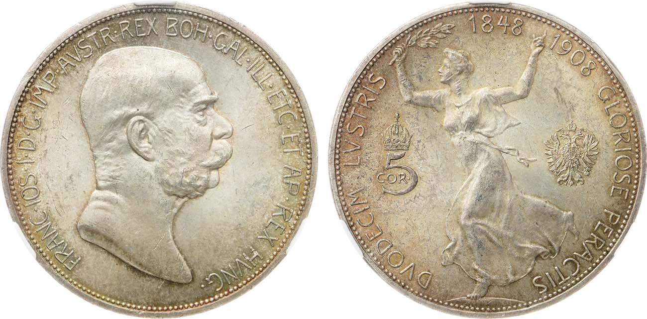 Серебро. Вена. Отчеканена в память 60-летия правления императора Франца Иосифа I. KM 2809. MS 62.