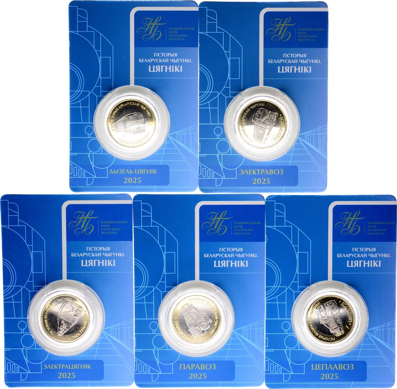 Биметалл. 5,81г. Казахстан, Усть-Каменогорск. Тираж 25000 экз. Диаметр 23,5 мм. Республика Беларусь. 2 рубля 2025 года. 5,81. Паровоз. KM UC# 1100. UNC. Республика Беларусь. 2 рубля 2025 года.5,81. Тепловоз. KM UC# 1101. UNC. Республика Беларусь. 2 рубля 2025 года. 5,81. Электровоз. KM UC# 1102. UNC. Республика Беларусь. 2 рубля 2025 года. 5,81. Электропоезд. KM UC# 1104. UNC. Республика Беларусь. 2 рубля 2025 года. 5,81. Дизель-поезд. KM UC# 1103. UNC.