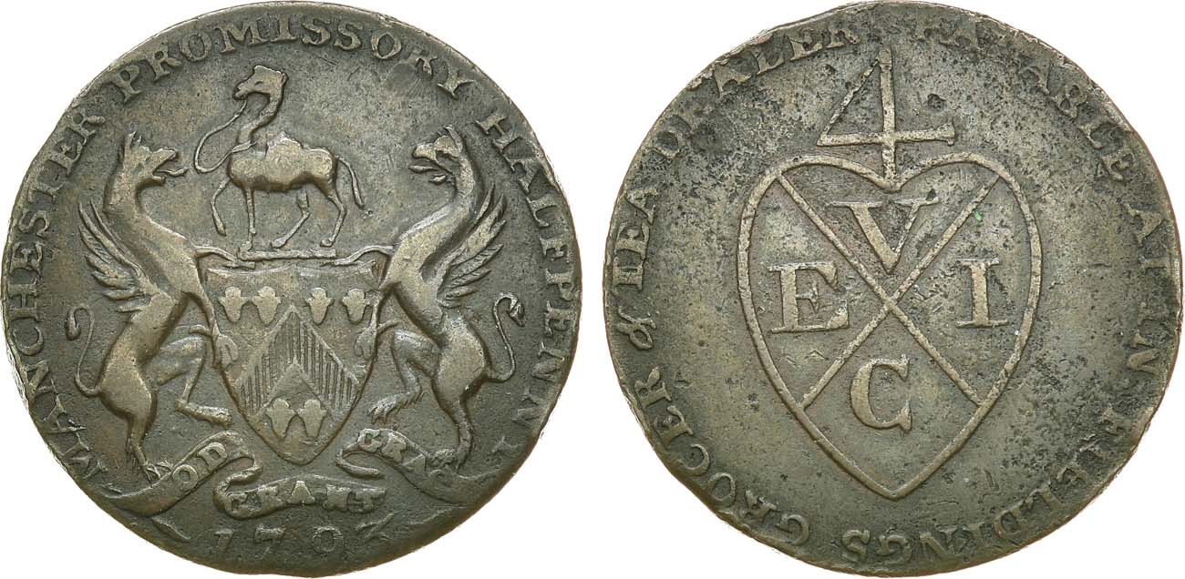 Бронза. 9,18г. Манчестер. Диаметр: 28 мм. Аверс: круговая легенда "MANCHESTER PROMISSORY HALFPENNY", герб бакалейной кампании. Реверс: эмблема Британской Ост-Индской компании; круговая легенда "PAYABLE AT IN: FIELDINGS GROCER & TEA DEALER". DH 129. XF.
