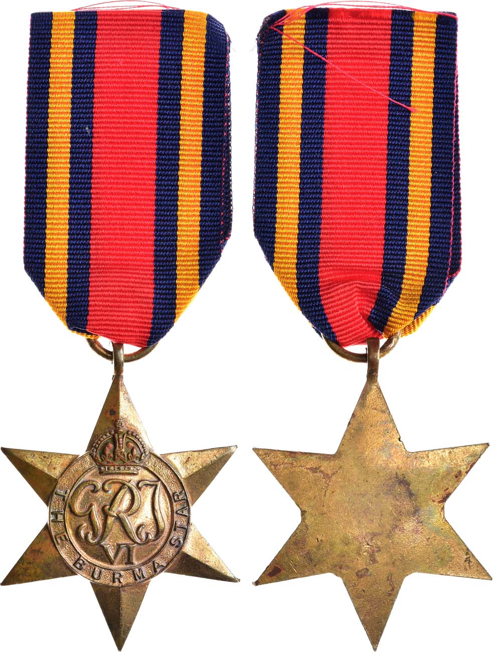 Бронза. Шестиконечная бронзовая звезда высотой 44 и шириной 38 миллиметров. Лучи звезды прямые, заострённые, двугранные. В центре находится круглый медальон с широкой каймой. В медальоне королевская монограмма Георга VI «GRI VI» (Georg VI Reg Imperator) коронованная королевской короной. В кайме надпись: «THE BURMA STAR». UNC.