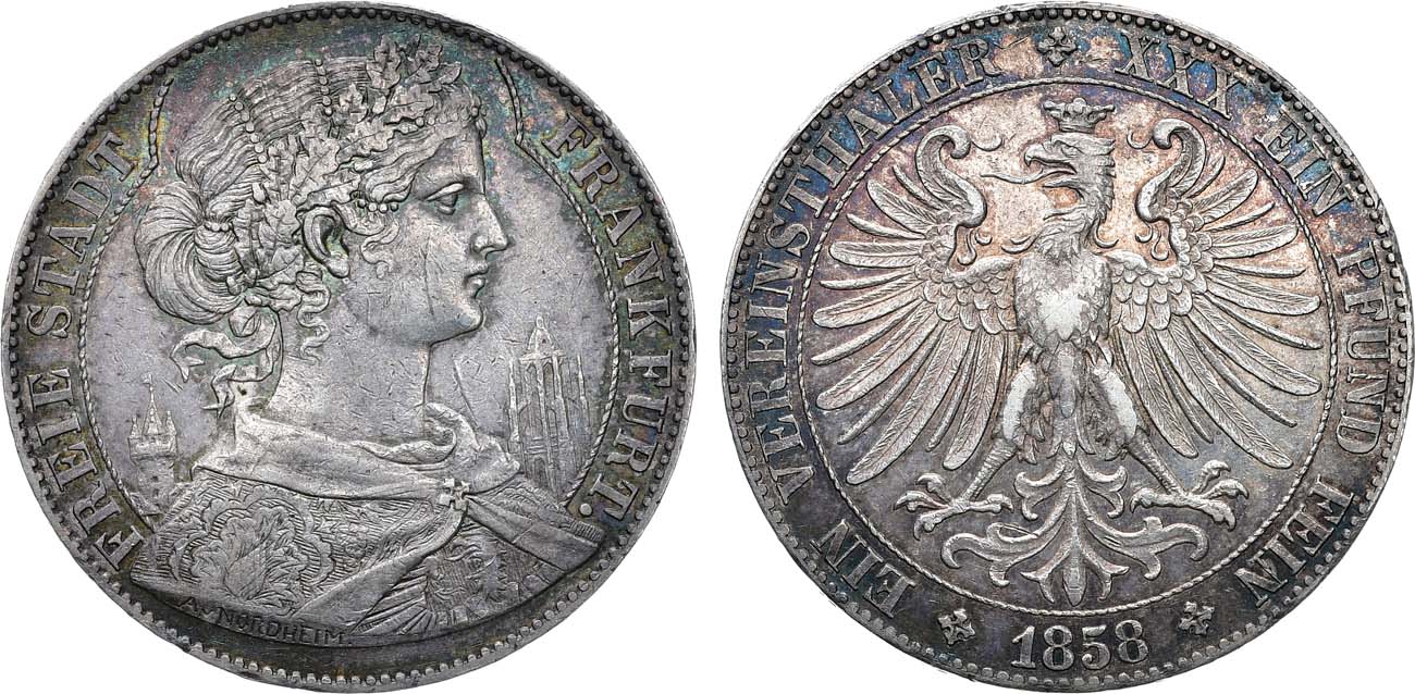 Равномерный штемпельный блеск. Насыщенная серая кабинетная патина с синевато-золотистыми оттенками по контурам рельефа. Небольшие забоины.