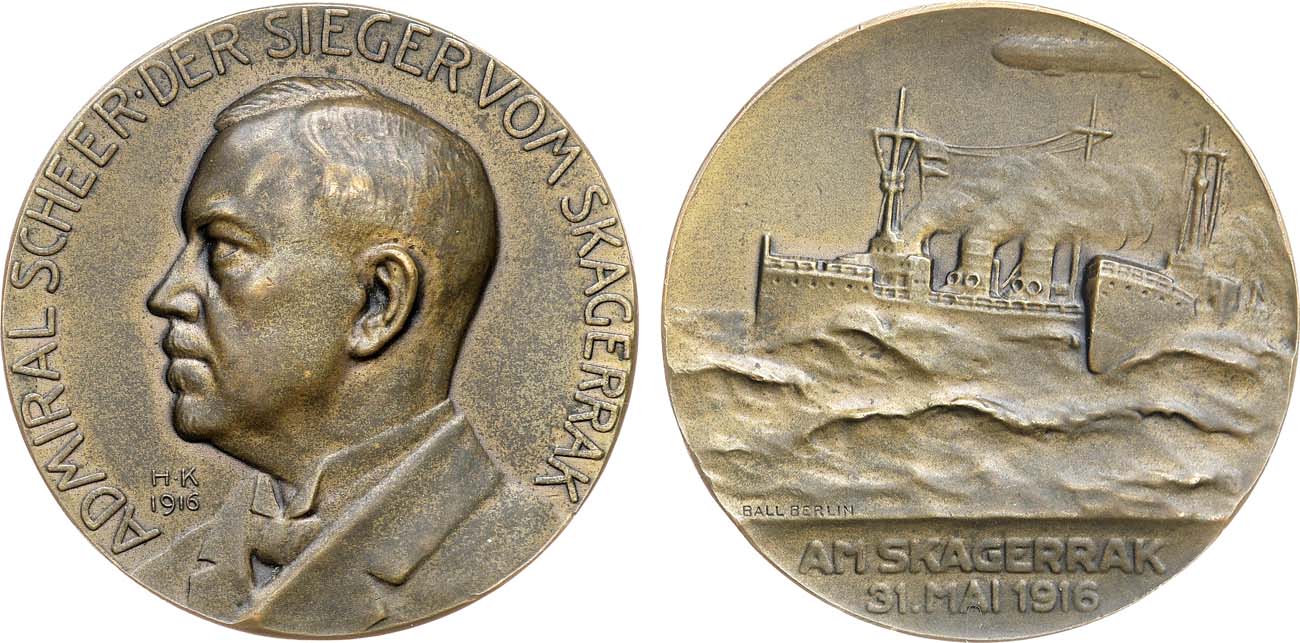 Бронза. 15,35г. Диаметр 35 мм. Аверс: портрет Карла Шеера влево в круговой надписи "ADMIRAL SCHEER. DER SIEGER VOM SKAGERRAK". Реверс: разведывательный отряд в составе двух линкоров и цеппелина, под обрезом надпись "AM SKAGERRAK / 31 MAI 1916". AU.