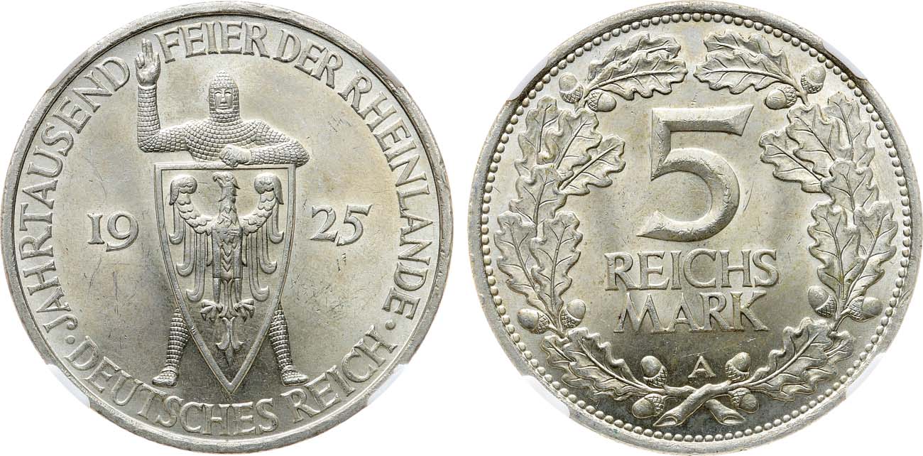 Серебро. Берлин (А). Отчеканена в память 1000-летия Рейнской области (Рейнланда). Тираж 680000 экз. KM 46. Jaeger 322. Weege 25. MS 64.