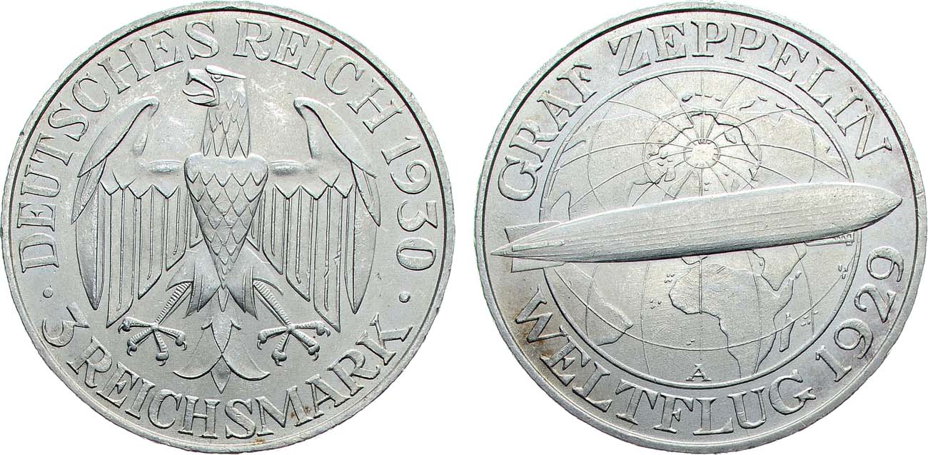 Серебро. 15,12г. Берлин (A). Отчеканена в память полёта дирижабля "Граф Цеппелин". Тираж: 217000 экз. KM 68. Jaeger 343. Weege 44. UNC.