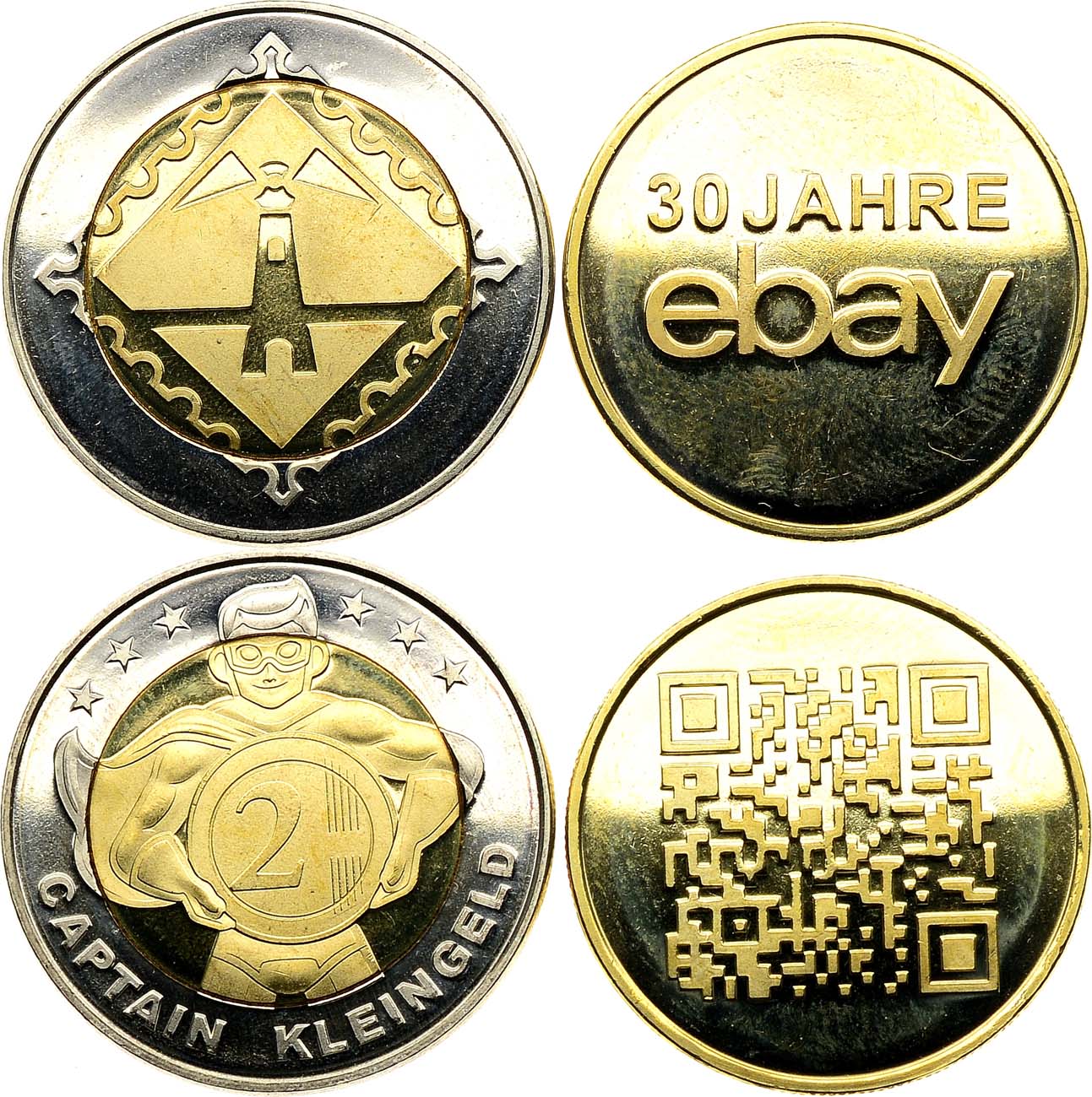 Жетон 2025 года. 30 лет со дня основания сайта eBay. Латунь. 6,65 г. Диаметр 24 мм. UNC. Жетон 2026 года. Капитан Кляйнгельд - поиск бракованных монет. Маяк. Биметалл. 12,5 г. Диаметр 26 мм. UNC. UNC.