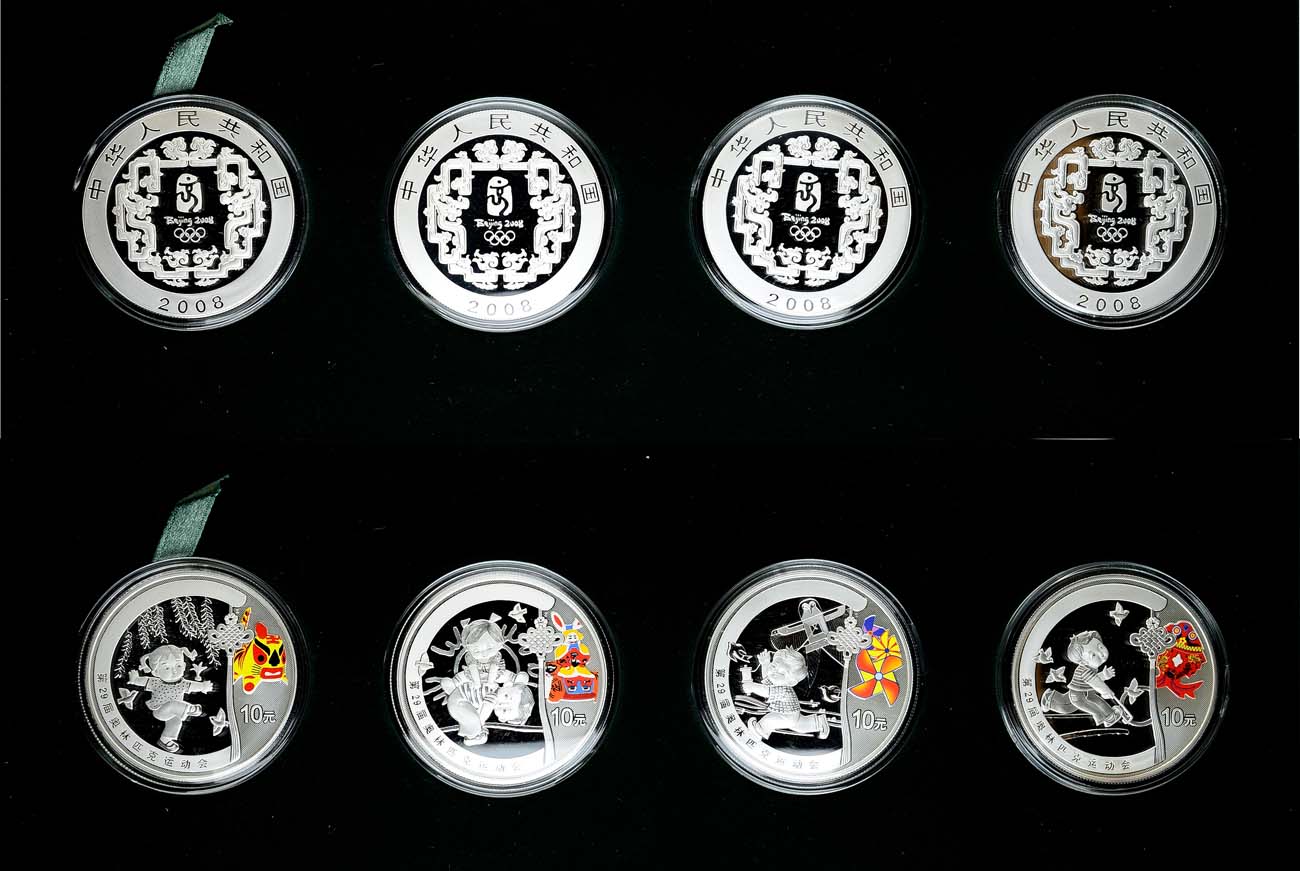 Серебро. Китай. Народная республика. 10 юаней 2008 года. XXIX в Пекине 2008 года. Серия I, Девочка с птицами, Цветная эмаль. 31,11 г.. Проба 999. Тираж 160000 экз. КМ 1705. Китай. Народная республика. 10 юаней 2008 года. XXIX в Пекине 2008 года. Серия I, Дети играют в чехарду, Цветная эмаль. 31,11. Проба 999. Тираж 160000 экз. КМ 1703. Китай. Народная республика. 10 юаней 2008 года. XXIX в Пекине 2008 года. Серия I, Мальчик с воздушным змеем, Цветная эмаль. 31,11. Проба 999. Тираж 160000 экз. КМ 1702. Китай. Народная республика. 10 юаней 2008 года. XXIX в Пекине 2008 года. Серия I, Мальчик с колесом, Цветная эмаль. 31,11. Проба 999. Тираж 160000 экз. КМ 1704. PROOF.